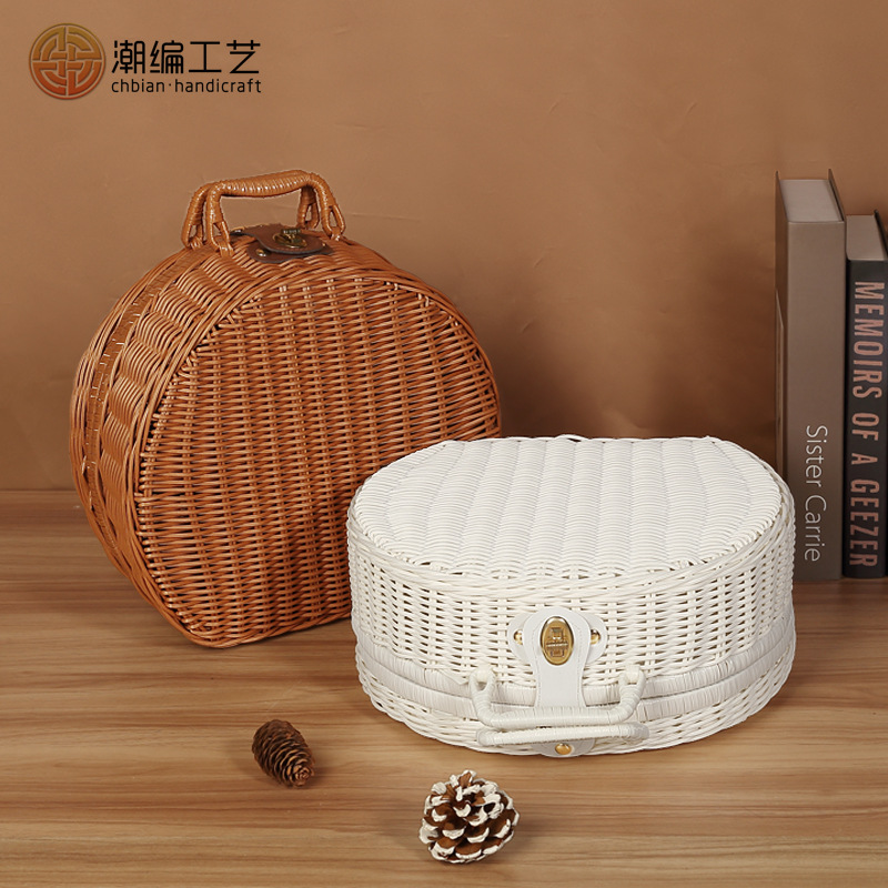 Fashionable New Style Portable Round Suitcase Accompanied Gift Box High-end Packaging Storage Box Retro Woven Rattan Gift Box