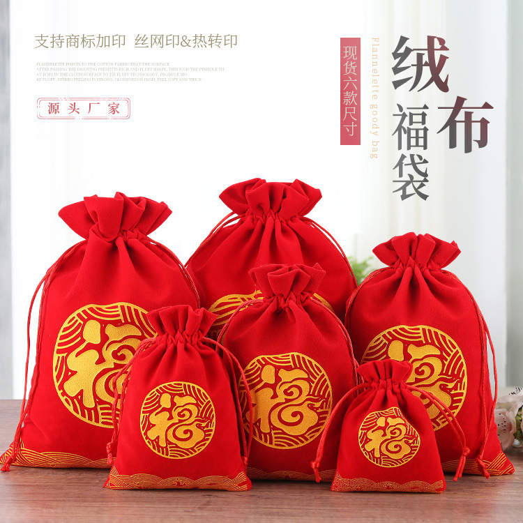 In-Stock Velvet Pouch Jewelry Bag New Year Lucky Bag Gift Drawstring Bag Red Envelope with Blessing Character
