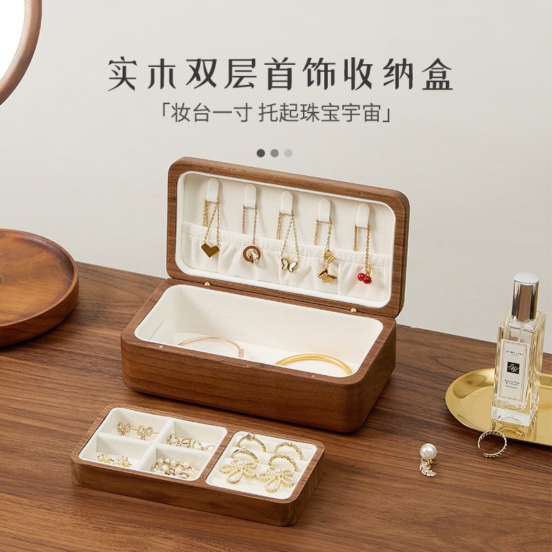 Black Walnut Jewelry Box Double-Layer Large Capacity New Solid Wood Desktop Storage Simple Small Portable Jewelry Box