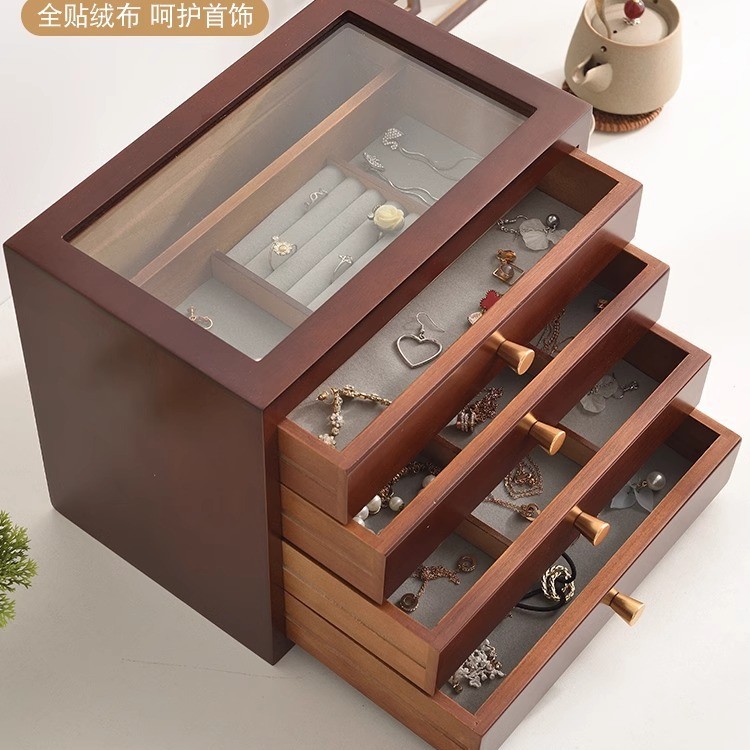 Large-Capacity Drawer Four-Layer Wooden Retro-Style Anti-Oxidation Jewelry Box Transparent Jewelry Box Solid Wood High-End