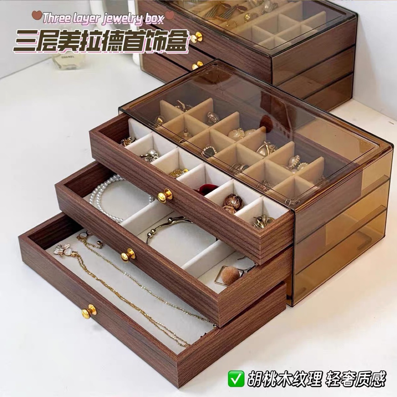 Three-Layer Walnut Jewelry Storage Box Drawer-Type Fashion Jewelry Storage Box Earrings Earrings Ring Necklace Jewelry