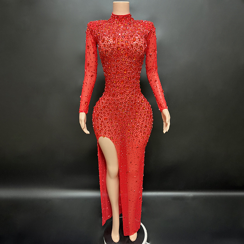 Novus Hot-Selling Products Shiny Red Diamond Side Slit Slim Elegant Long-Sleeved Evening Dress Long Dress