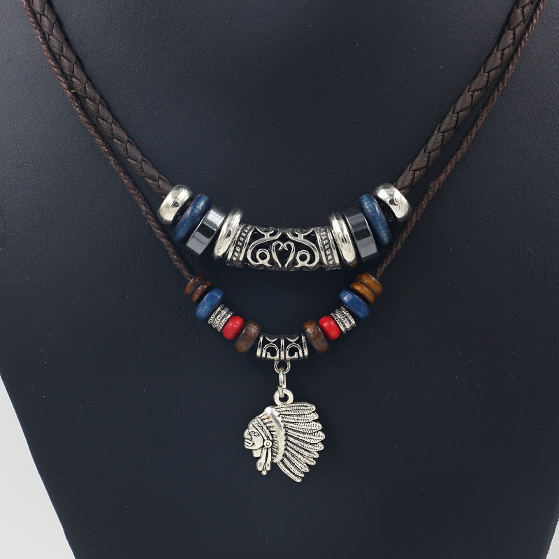 Tribal jewelry new multi-layer retro ethnic clavicle chain double braided leather rope beaded men's necklace