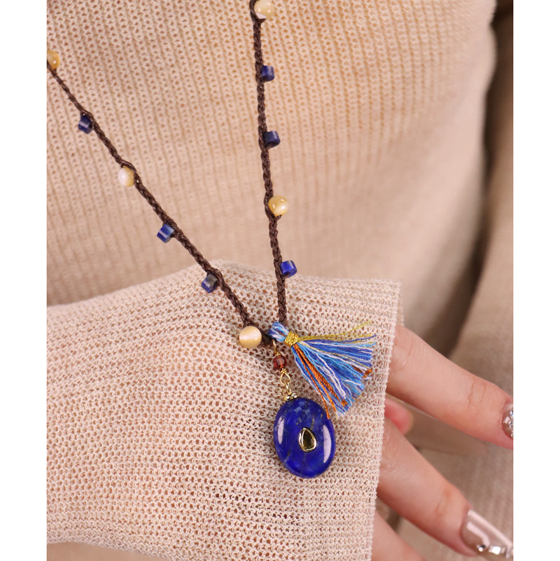 Medieval-Style Natural Lapis Lazuli and Natural Mother-Of-Pearl Braided Long Necklace, Layered Tassel Sweater Chain, Tribal Ethnic Style