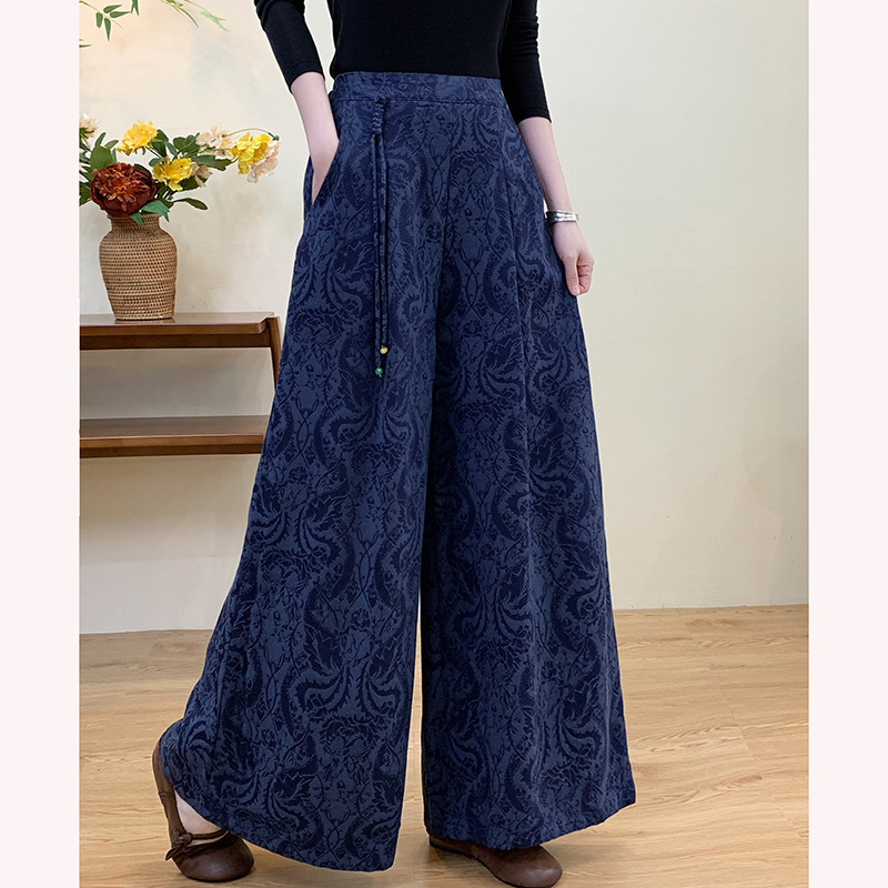 Pendant Jacquard Cotton and Linen Wide-Leg Pants Ethnic Style Pants 2025 Autum New Pants Elastic Waist Large Size Straight Pants