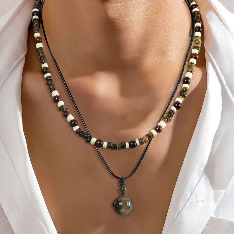 Cross-Border Casual Vacation Style Coconut Shell Wooden Beads Rice Beads Sun Pendant Necklace Men's Hip-Hop Tribal Retro Necklace