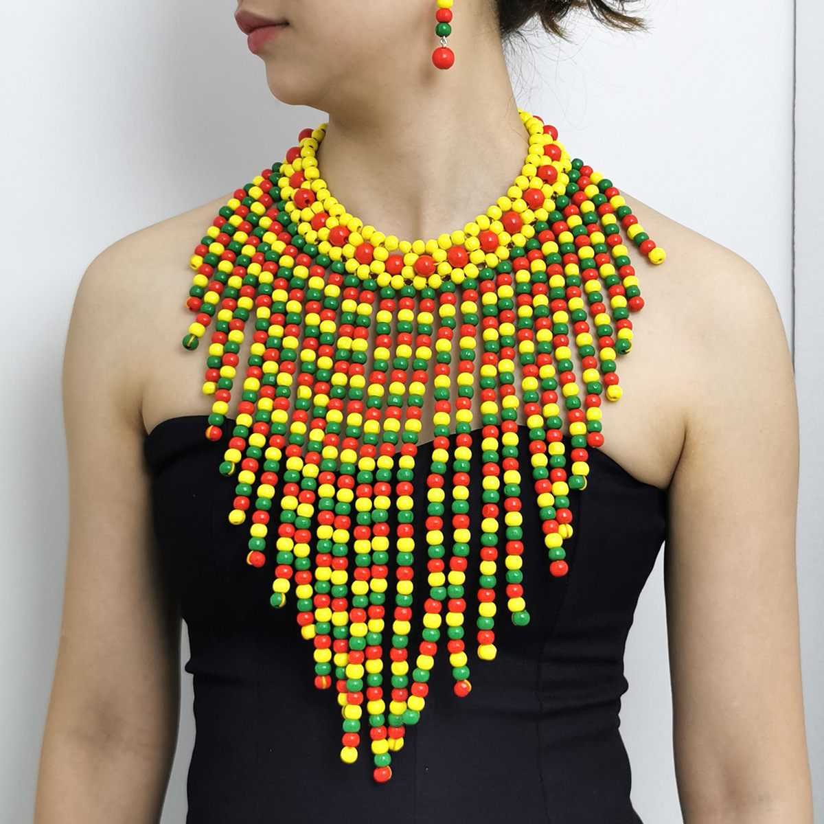 African Tribal Style Accessories Handmade Long Wooden Beads Tassel Women Exaggerated Necklace Earrings suit Big Fashion