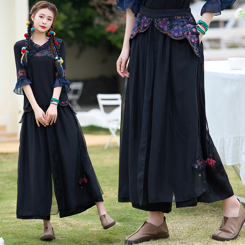 2024 New Ethnic Style Jacquard Satin Embroidery Patchwork Lace-Up Floral Bud Pendant Wide-Leg Pants Skirt Faux Double-Layer Long Pants