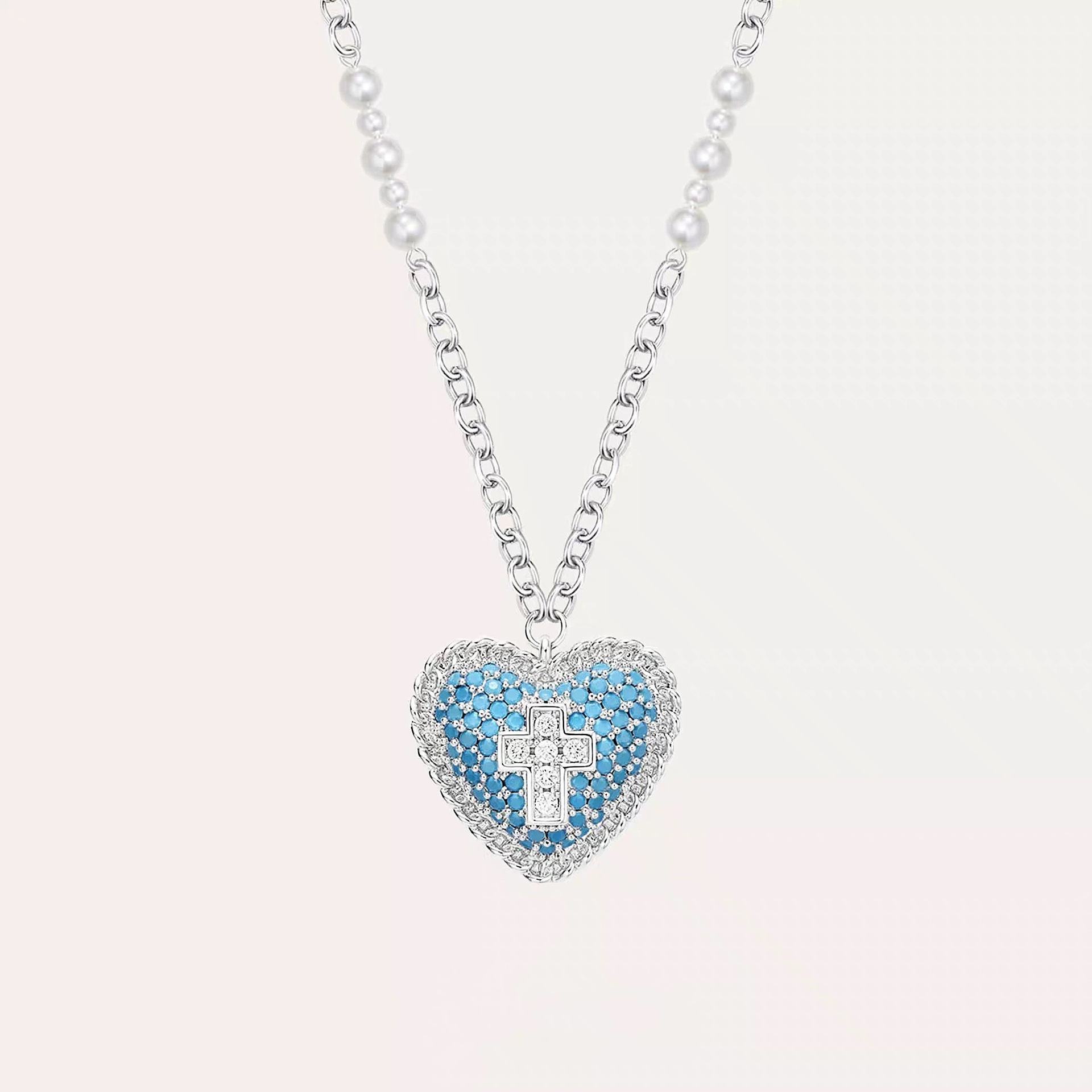 Niche Design Cross Blue Pine Stone Accessible Luxury Retro Pearl Long Necklace Sweater Chain Sweet Heart Necklace