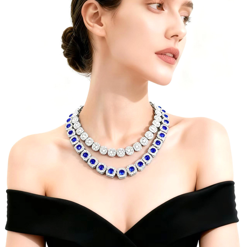 Alloy Necklace Square Ice Sugar Sapphire Cuban Necklace Light Luxury Style Personalized Unisex Wear Sugar Cube Collarbone Necklace