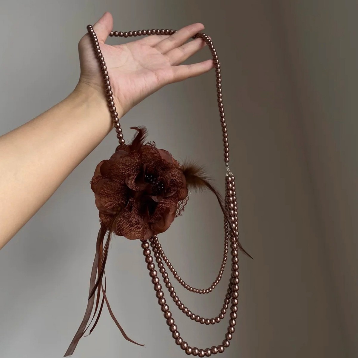 Vintage Artistic Coffee Color Flower Pendant Necklace Ethnic Style Multi-Layer Beaded Collarbone Chain Women's Fashion Versatile Necklace