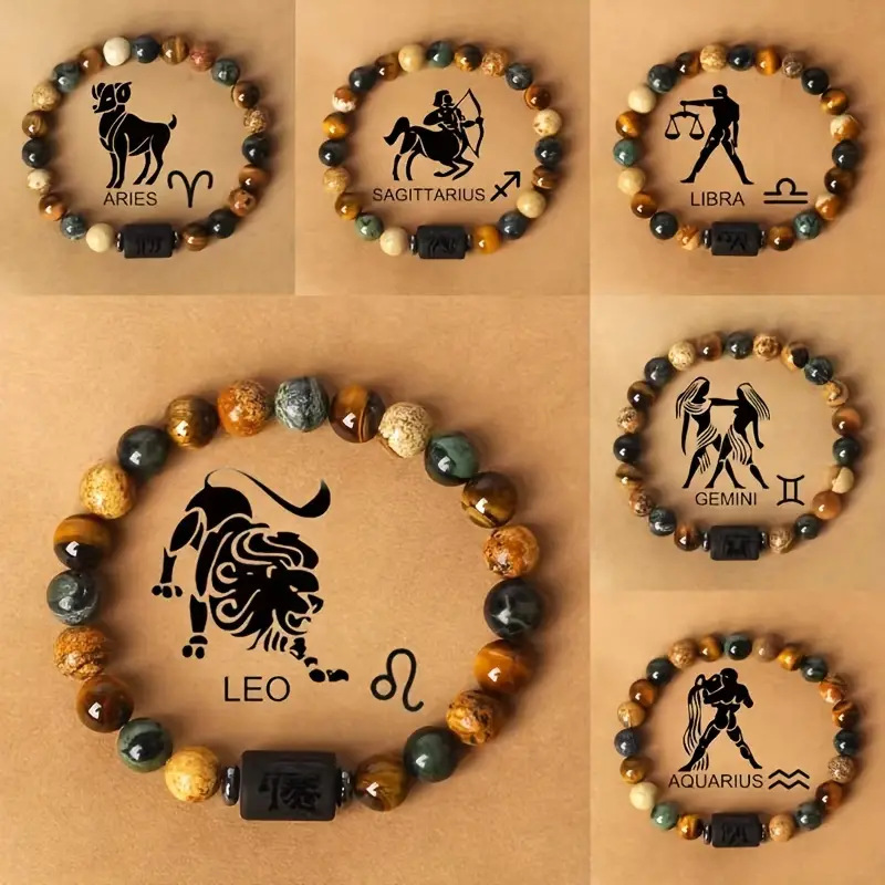 Twelve Constellation Natural Stone Beads Bracelet Explosive Hot Selling Tiger Eye Stone Picture Stone Mix Beaded Bracelet