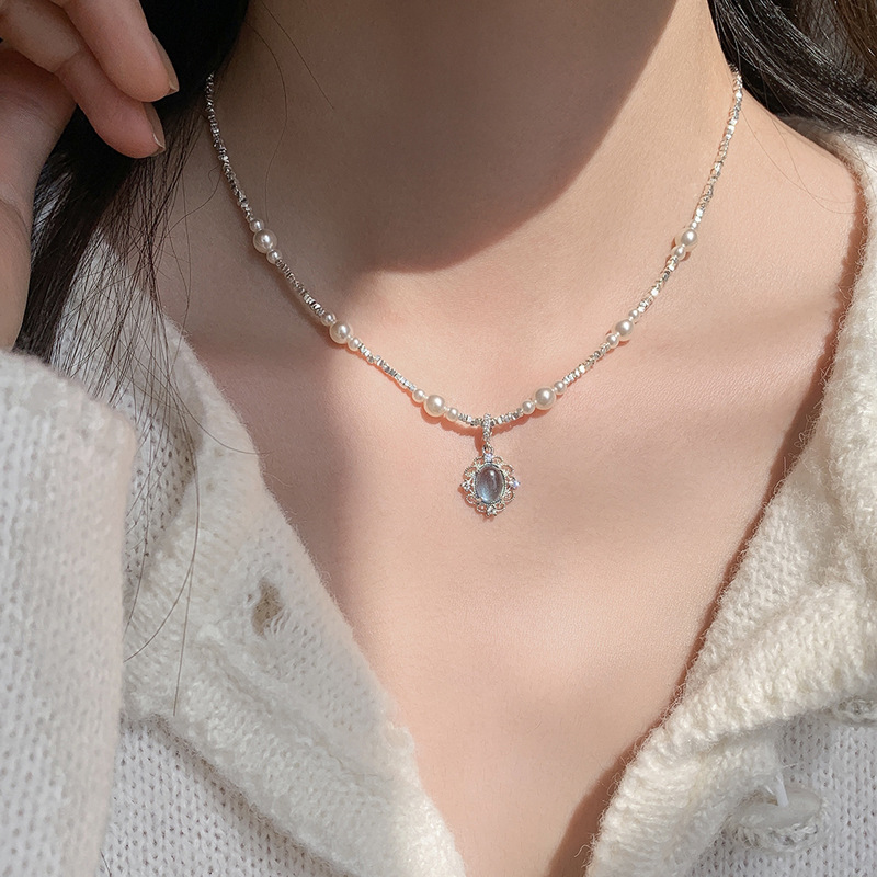 Aquamarine Broken Silver Pearl Necklace Women's Niche Easiest for Match 2025 New Elegant Light Luxury Design High-End Neck Accessories