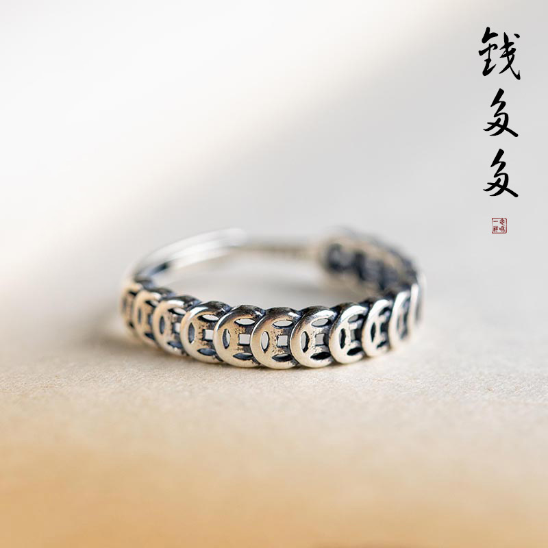 s925 Silver Plated Retro Ring Women's Lucky Money Gathering Coin Personalized Design Simple Niche Opening Transfer Bead Ring