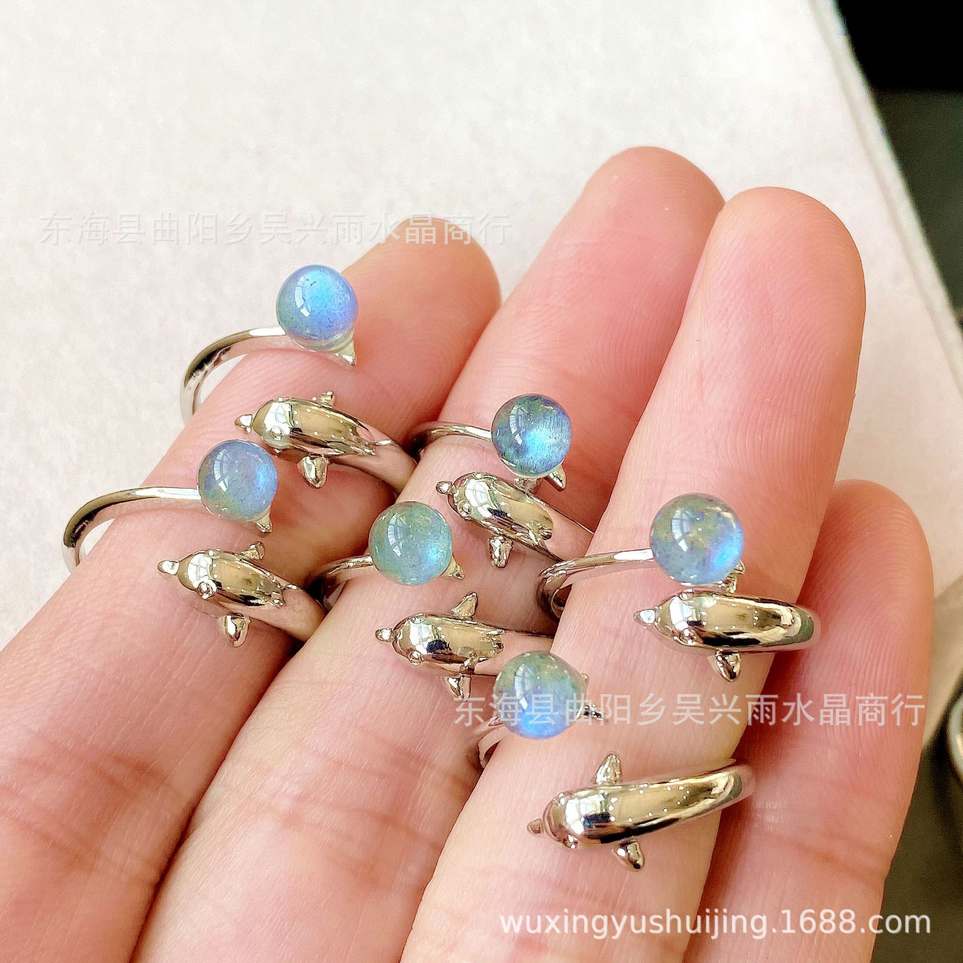 Natural Crystal Lavolite Moonstone Round Bead Ring Blue Light Loop Can Adjust Size