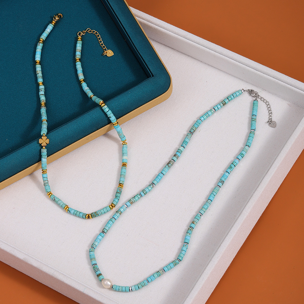 New Chinese-Style Retro Natural Turquoise Necklace with Pearl and Four-Leaf Clover Sweater Chain for Women, Light Luxury Niche High-End Jewelry