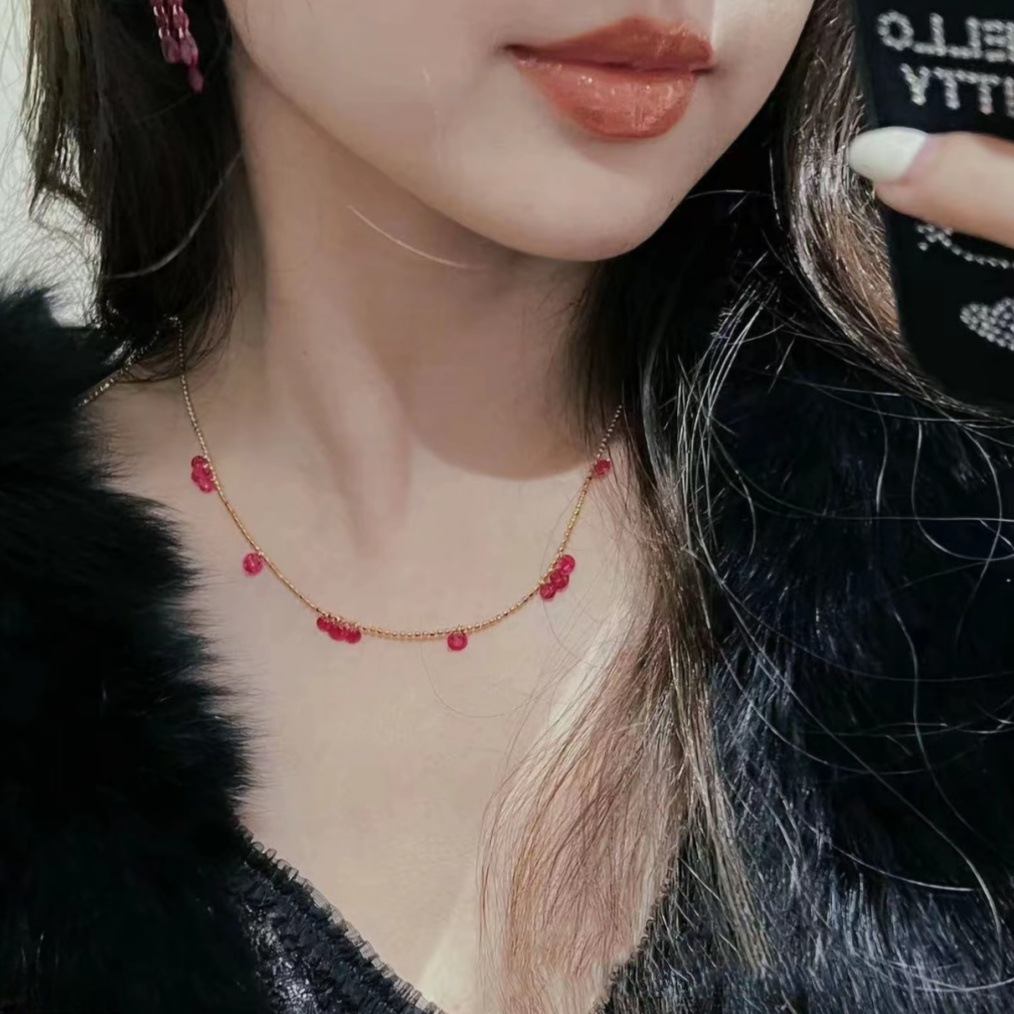 S925 Silver Necklace Rose Red Bead Zircon Ins Necklace High Quality Handmade Retro Colorful Versatile Simple Clavicle Chain