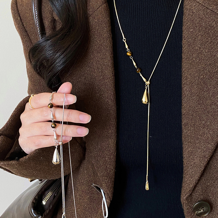 Tiger Eye Stone Beaded Water Drop Pull-Out Necklace Autumn and Winter Niche Design Sweater Chain Commuting Versatile Necklace Wholesale