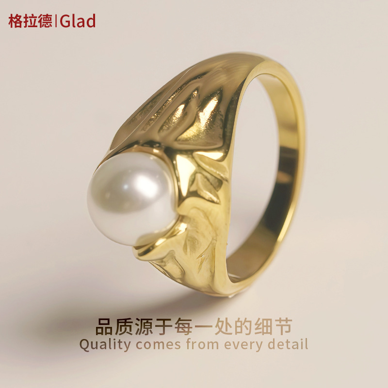 Cross-Border Exclusive Supply of European and American Style Titanium Steel Imitation Pearl Rings, Gold-Plated Rings, Niche Design Pearl Rings