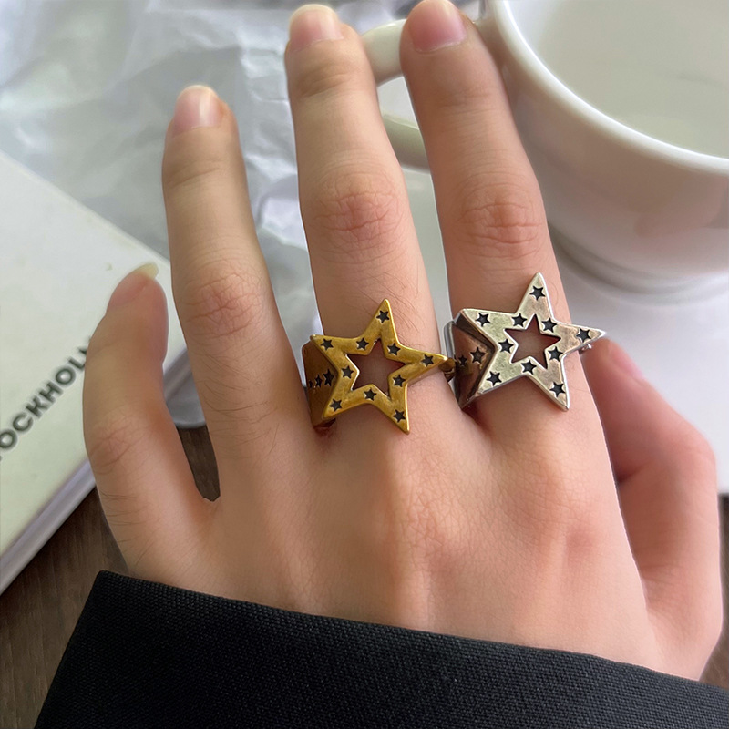Lanzhi Five-Pointed Star Ancient Gold Open Ring Women's Non-Fading Niche Design Hip-Hop 925 Sterling Silver Ring Index Finger Ring