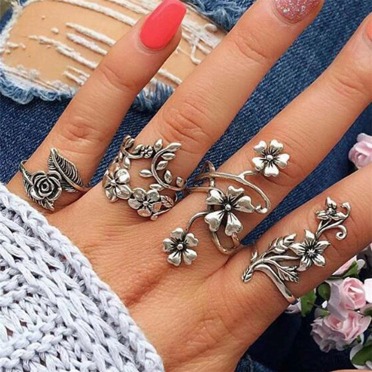 Cross-border set ring retro personality ancient silver forest vine leaves flower hollow ring wholesale R1357