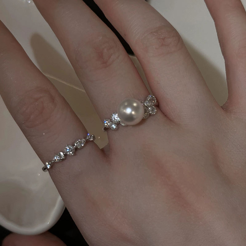 Light Luxury High-end Sense Fine Flash Zircon Pearl Opening Ring Women's Elegant Retro Fashion Distinctive All-match Ring Ring Ring