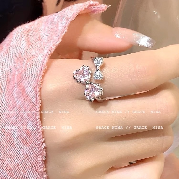 Sweet dizzy! Pink Diamond Bow Ring Women's Light Luxury Elegant Finger Ring Niche Design High Sense Fashion Ring