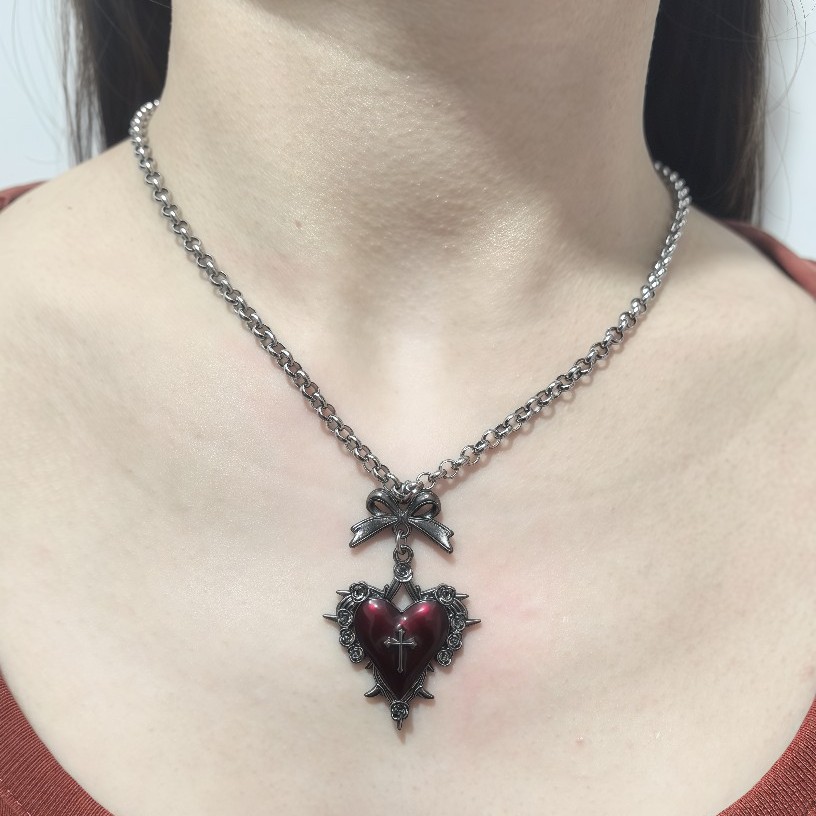 Diablo Gothic Punk Red and Black Love Bow Cross Metal Necklace Niche Ins Style Vintage