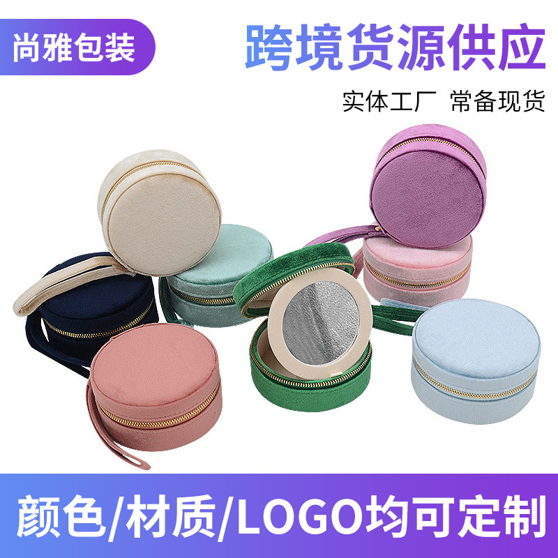 In stock new large capacity portable velvet zipper jewelry storage box round mirror jewelry box