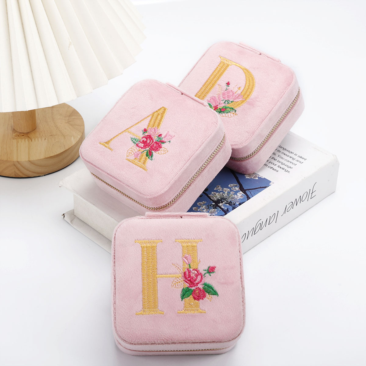 Qingyu Packaging Velvet Jewelry Box Letter Embroidery with Mirror Portable Ring Necklace Jewelry Storage Box