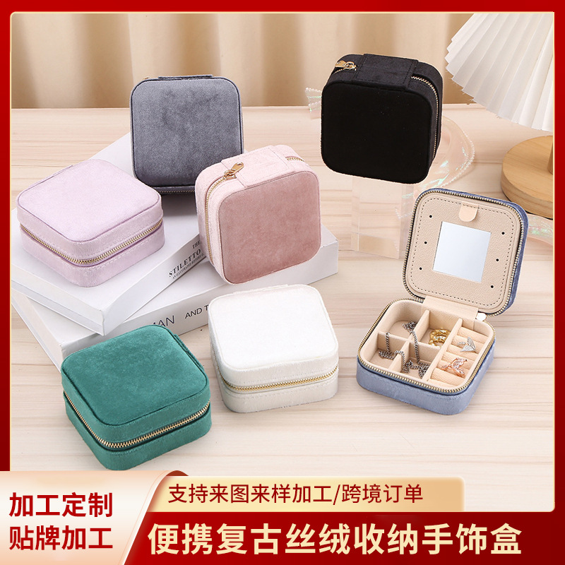 New Velvet Ring Storage Box Simple Zipper Flip Earrings Earrings Ring with Mirror Storage Jewelry Box