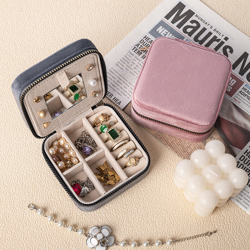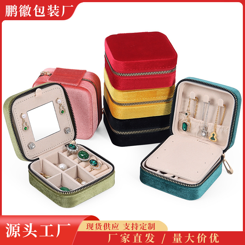 Fashionable Velvet Zipper Jewelry Box with Mirror Ring Necklace Earrings Packaging Travel Portable Hand Jewelry Storage Box
