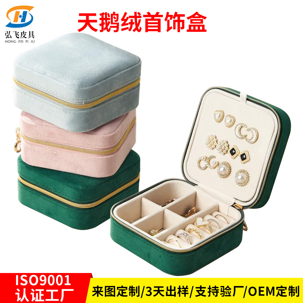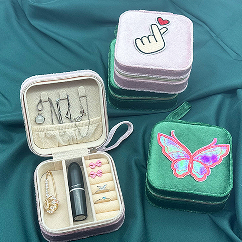 Velvet Love Jewelry Storage Box Portable Zipper Ring Necklace Casual Square Round Jewelry Storage Box