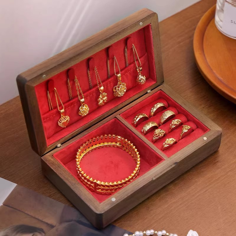 Gift Jewelry Box Velvet Cloth Engagement Black Walnut Solid High-End Three Gold Set Storage Box Large Capacity Display
