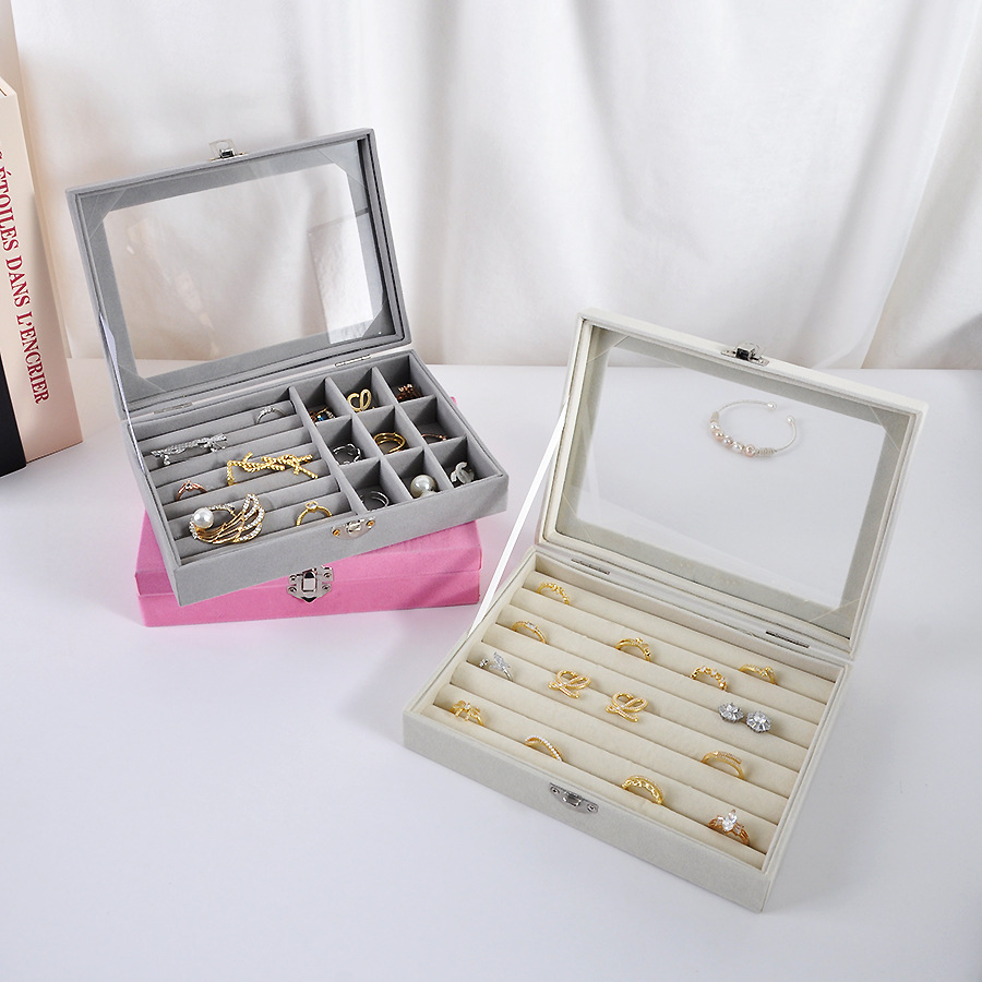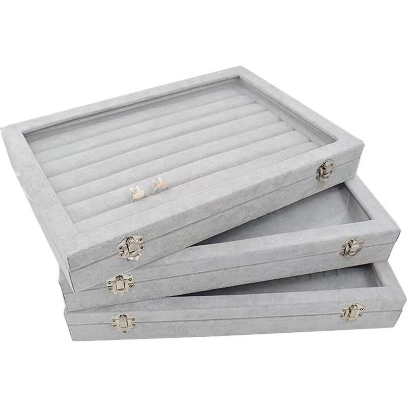 Large Capacity Simple Jewelry Storage Box Grey Velvet Glass Cover Shop Display Earrings Pendant Ring Necklace Small Plaid