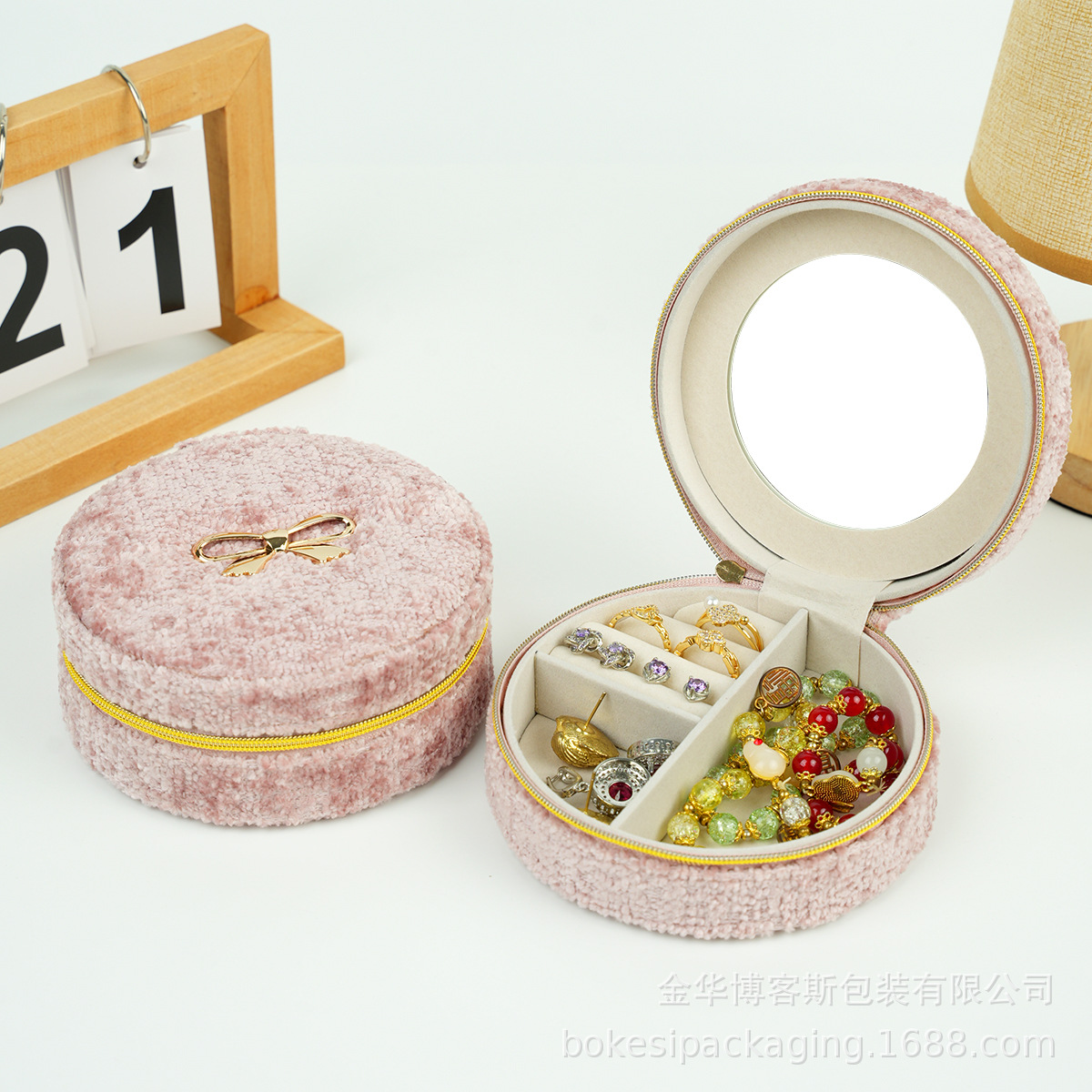 New Product Debut Pink Round Teddy Velvet Jewelry Box with Mirror Ring Bracelet Necklace Jewelry Storage Box