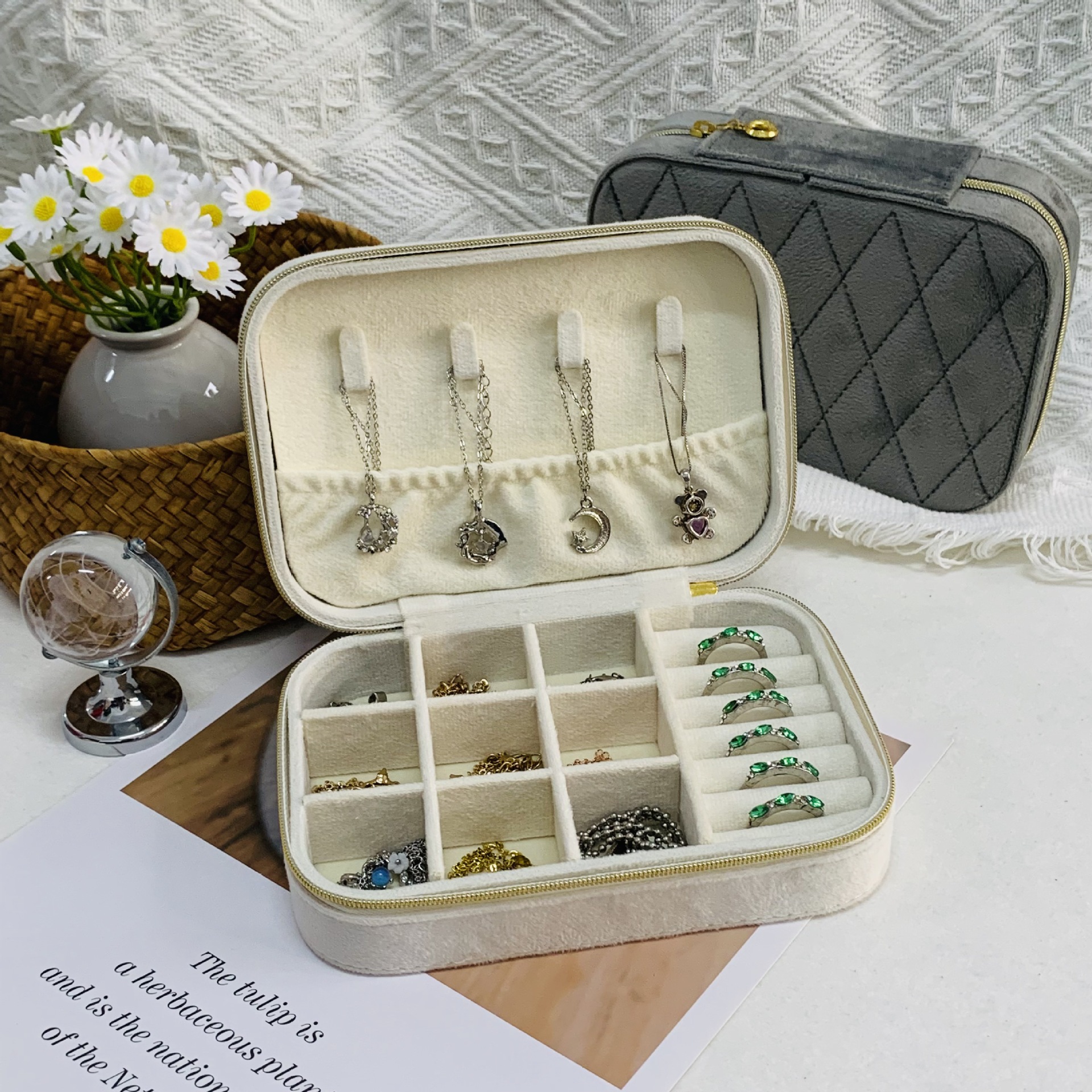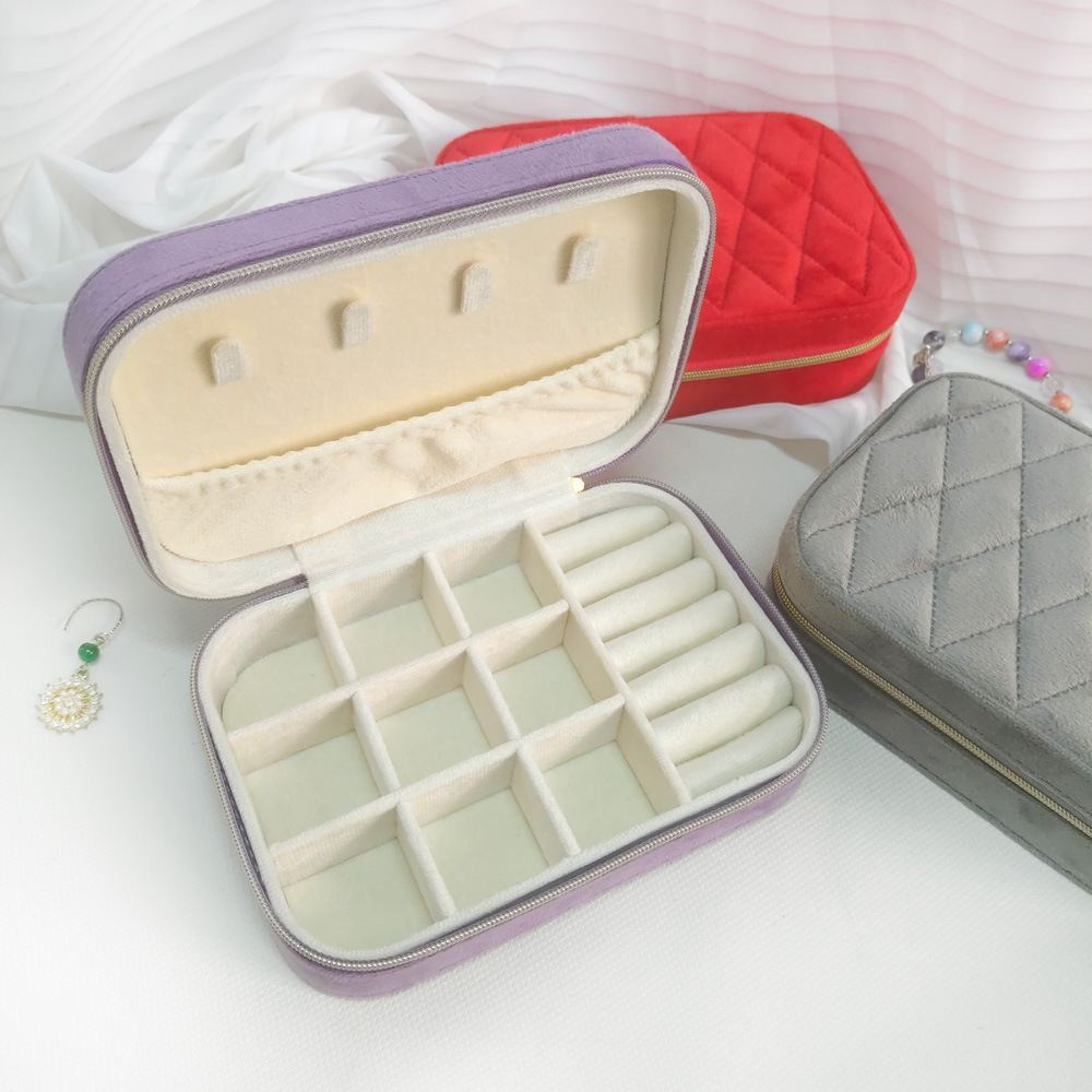 Classical Square Portable Velvet Jewelry Box Zipper Jewelry Clutch Bag Diamond Ring Necklace Earrings Jewelry Storage Box