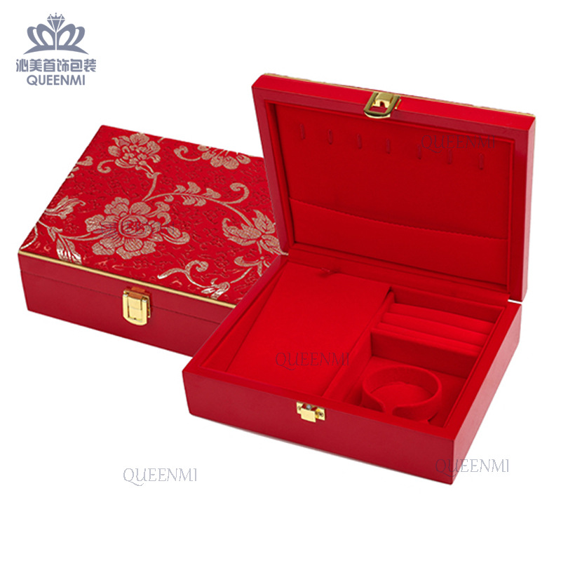 in stock Chinese Red Velvet Wood Baking Paint Wedding Three Gold Box Flower Face Flip Cover Red Paint Wooden Box Accompanying Jewelry Box
