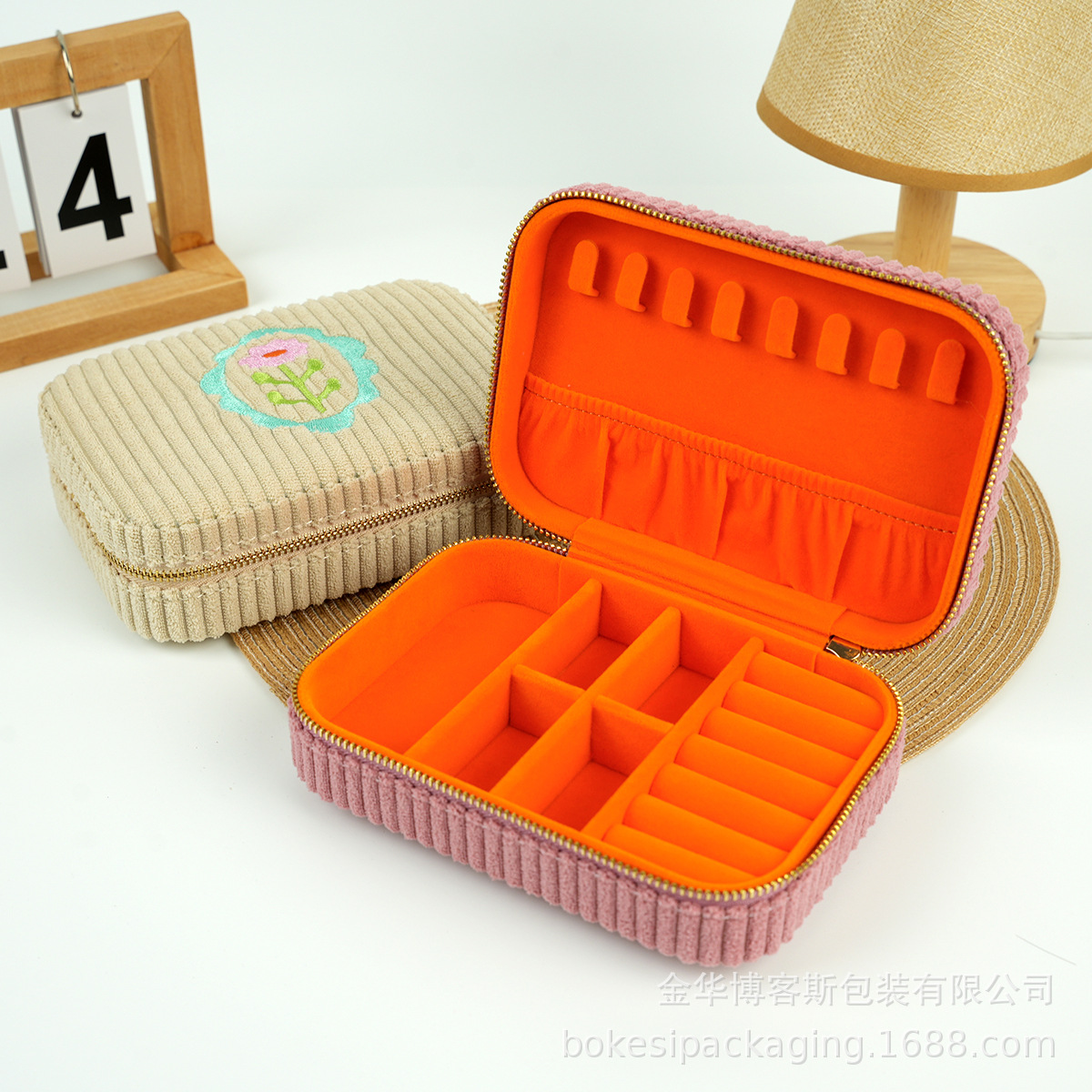 Embroidered Corduroy Fresh Style Medium Zipper Jewelry Storage Bag Supports Attribute Color Customization