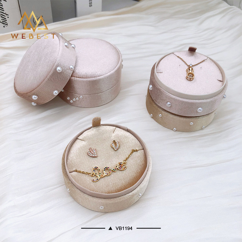 Fancy Pearl Heaven and Earth Cover Round Silk Velvet Box Champagne Color Necklace Bracelet Packaging Box Earrings Box Customized