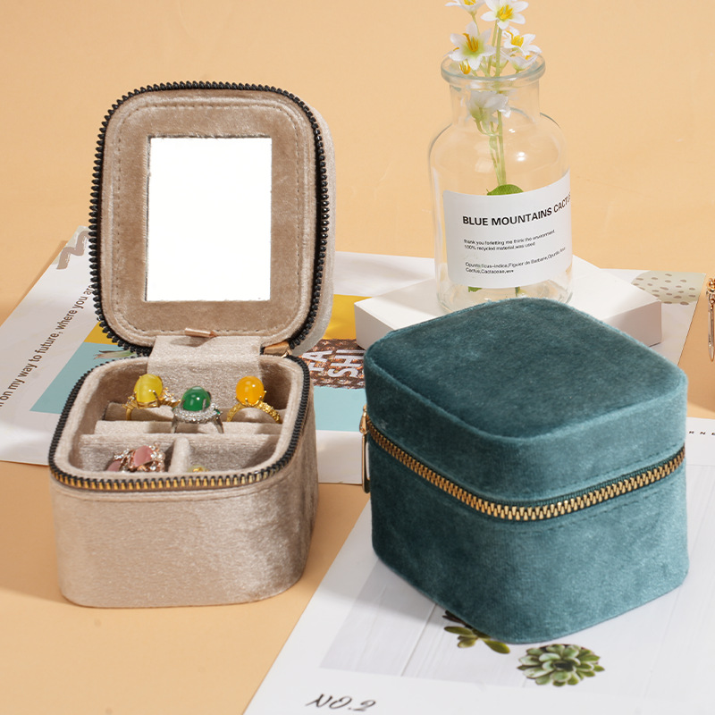 Modern Style Italian Velvet with Mirror Zipper Jewelry Box Square Multi-Functional Mini Ring Cosmetics Bag for Women