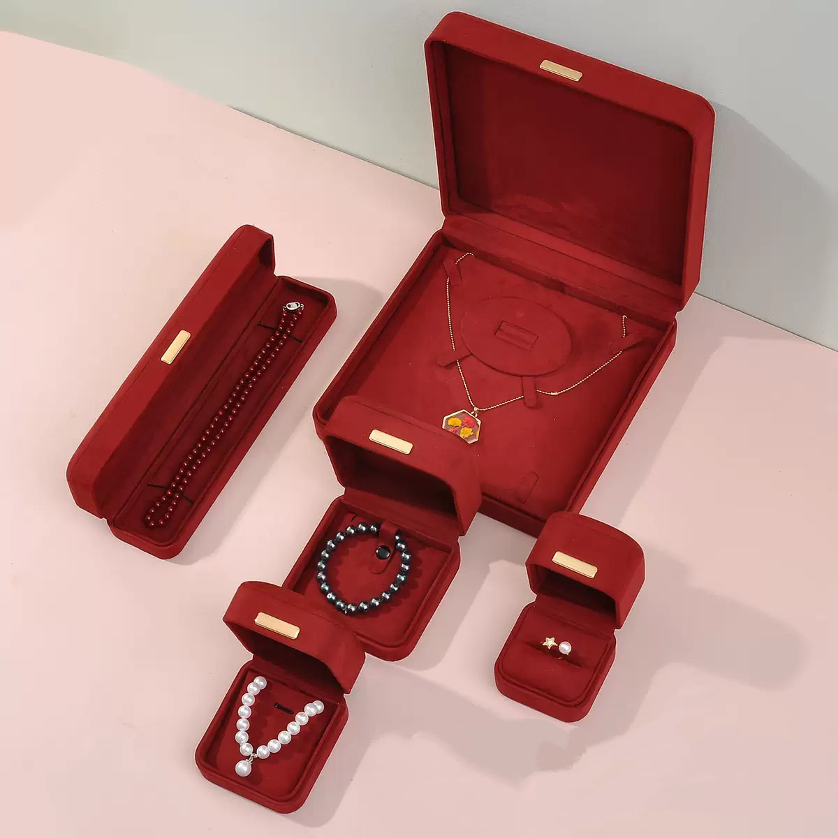 Jewelry Ring Necklace Bracelet Pendant Box Wholesale High-End Arch Top Burgundy Milan Velvet Packaging Box Gift Box