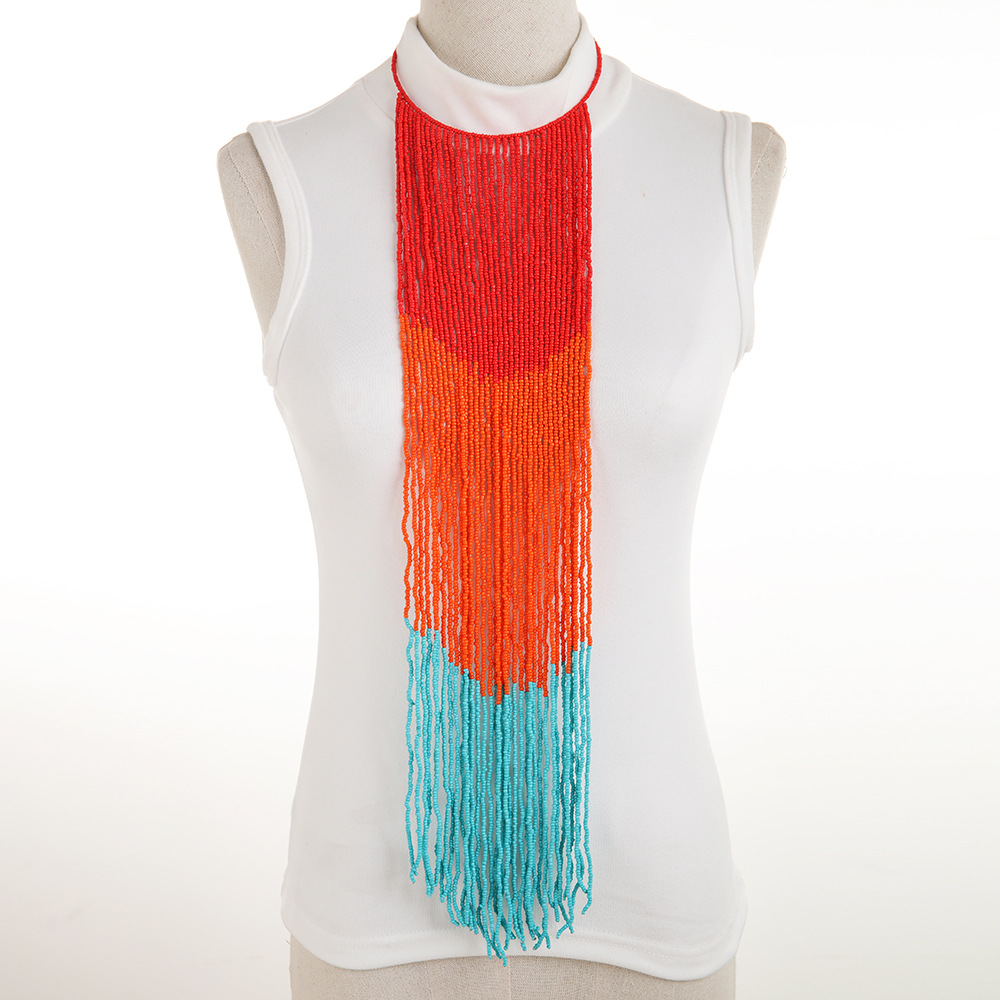 European and American cross-border exaggerated bohemian style handmade beaded long color tassel necklace hand-woven manufacturer