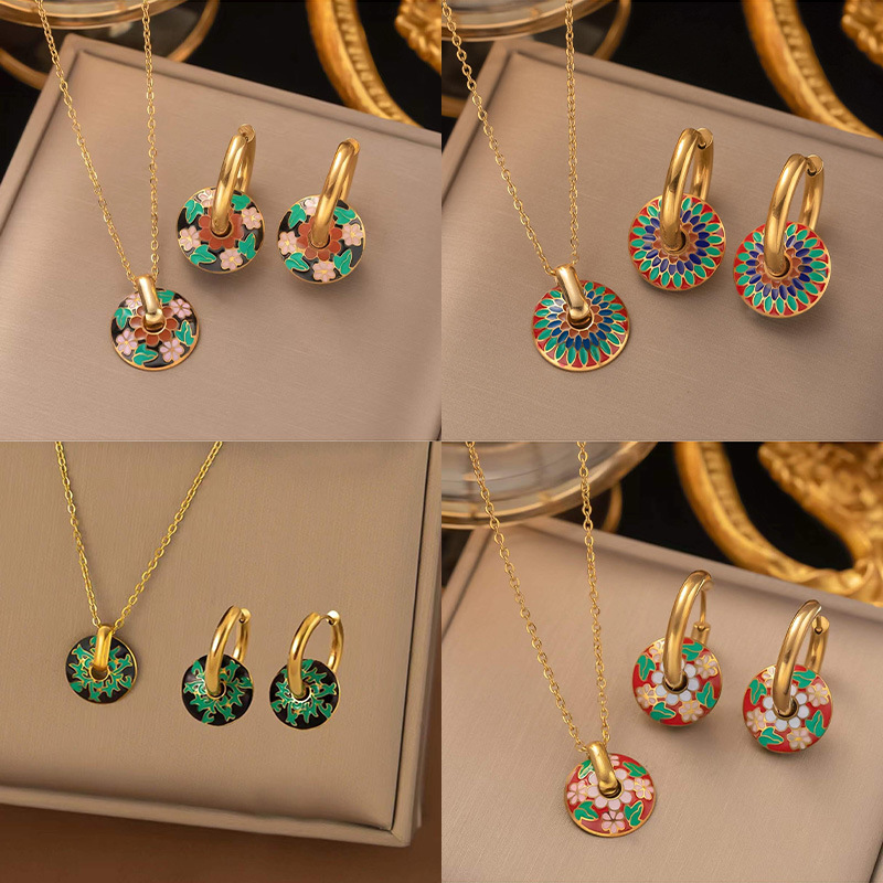 Cross-border European and American fashion retro painted daisy pattern circle fashion necklace earrings suit women titanium steel does not fade