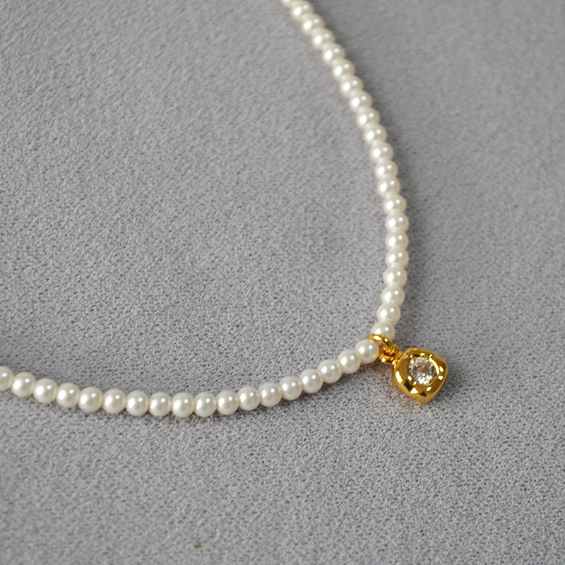 French Elegant Niche Design Imitation Pearl Simple and Delicate Asymmetrical Zircon Flower Pendant Short Necklace