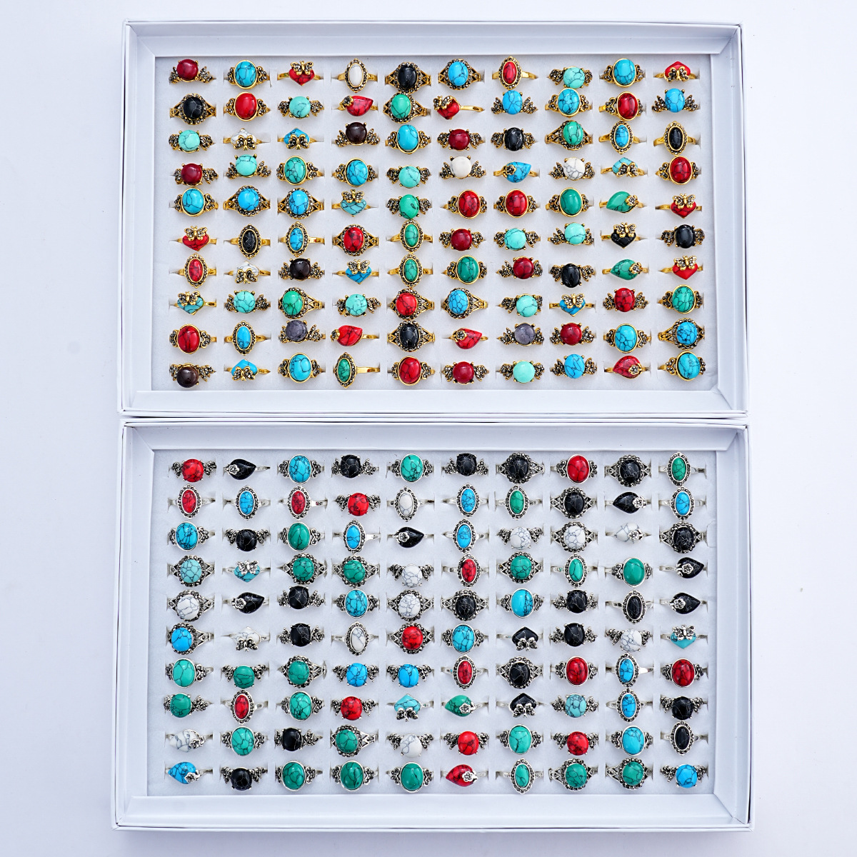 Cross-Border Retro Style Geometric Turquoise Ring Plated with Ancient Silver and Black Diamond Women's Index Finger Ring Foreign Trade Spot Wholesale