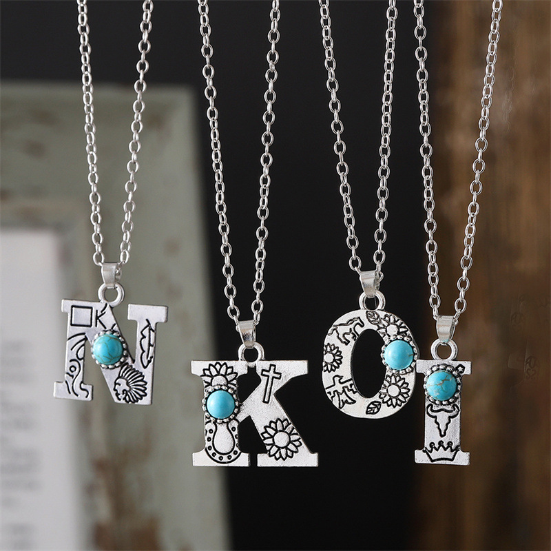 Amazon New Retro 26 English Letter Turquoise Necklace Clavicle Chain Creative Pattern Carving Design Necklace
