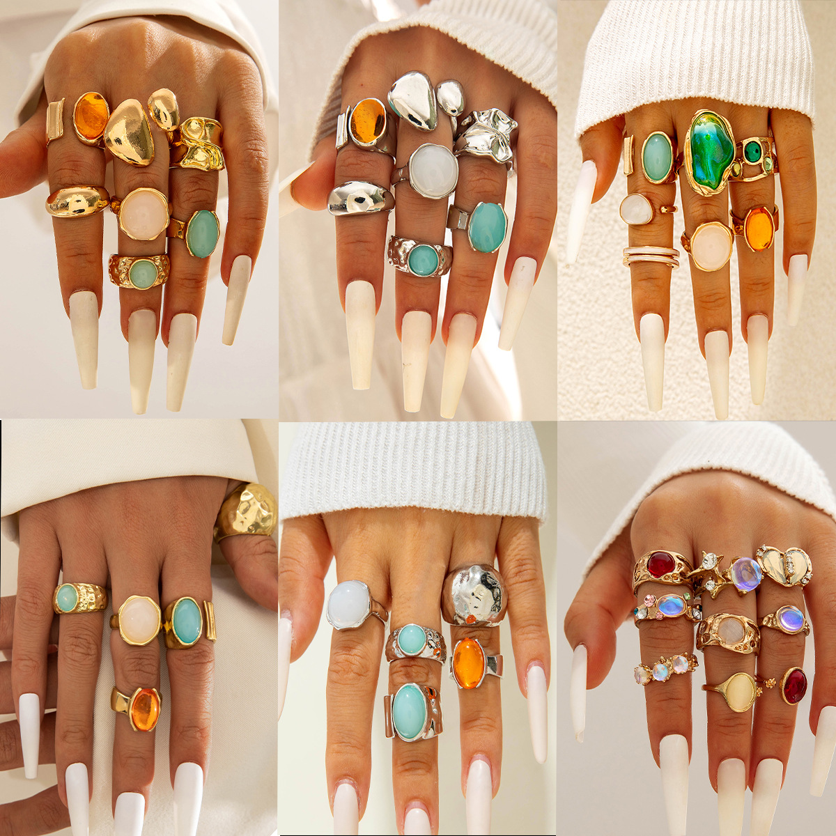 European and American Cross-Border Fashion Alloy Inlaid Gemstone Vintage Ring Geometric Ins Style Irregular Ring Set for Women
