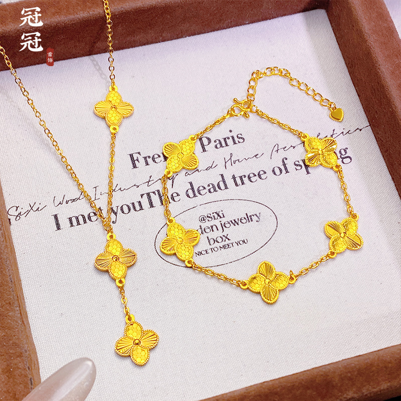 Sand Gold Jewelry Cnc Fish Scale Four-Leaf Clover Necklace Pendant Long-Lasting Color Retention Bracelet for Women, Light Luxury High-End Clavicle Chain