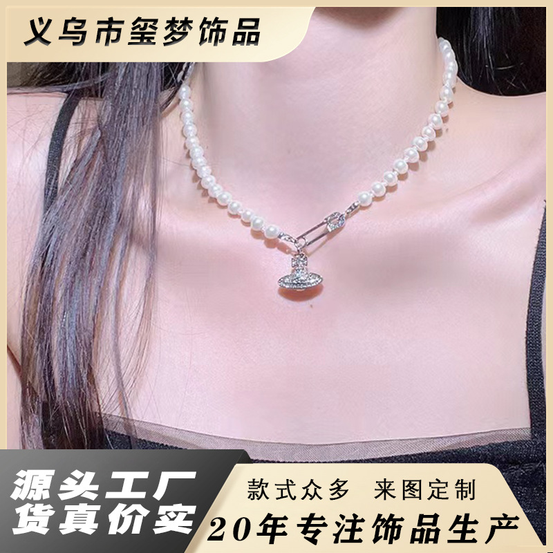 Empress Saturn Pearl Pin Necklace for Women with Diamonds and Zircon Choker Collarbone Chain, Same Style as Ouyang Nana